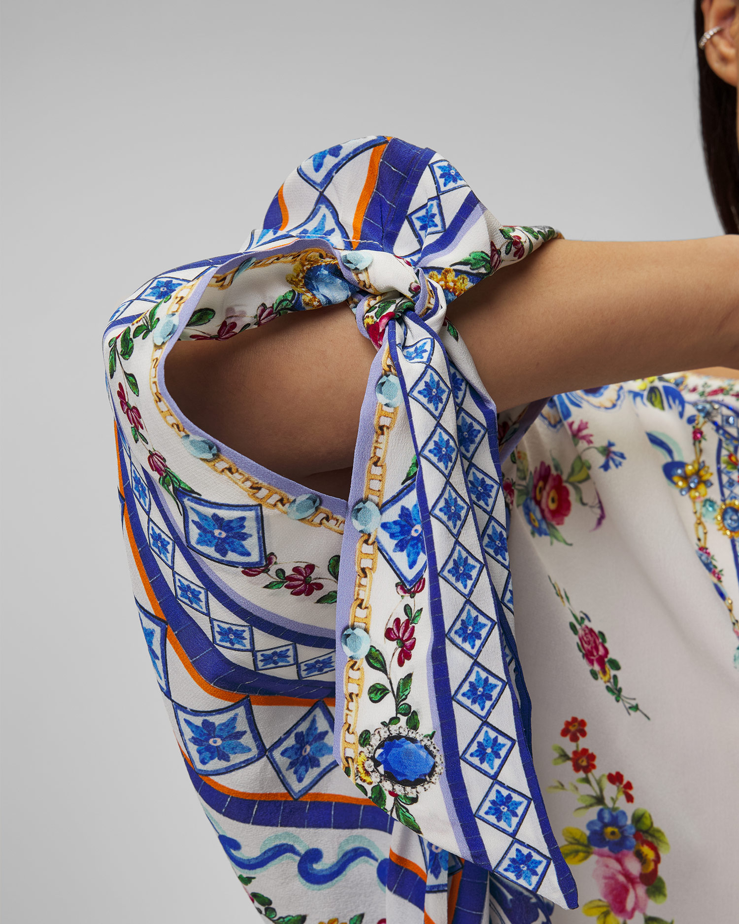 Tunika Tiles Darls Tie Sleeve Kaftan je uměleckou interpretací italských dlaždic a květinových ornamentů, kde odstíny modré a oranžové tvoří výjimečnou mozaiku barev a významů. Model inspirovaný řemeslnou tradicí minulých epoch oslavuje krásu ruční práce a nadčasové estetiky. Luxusní hedvábí CAMILLA zvýrazňuje pohyb a lehkost, čímž vytváří formu plnou svobody a elegance.