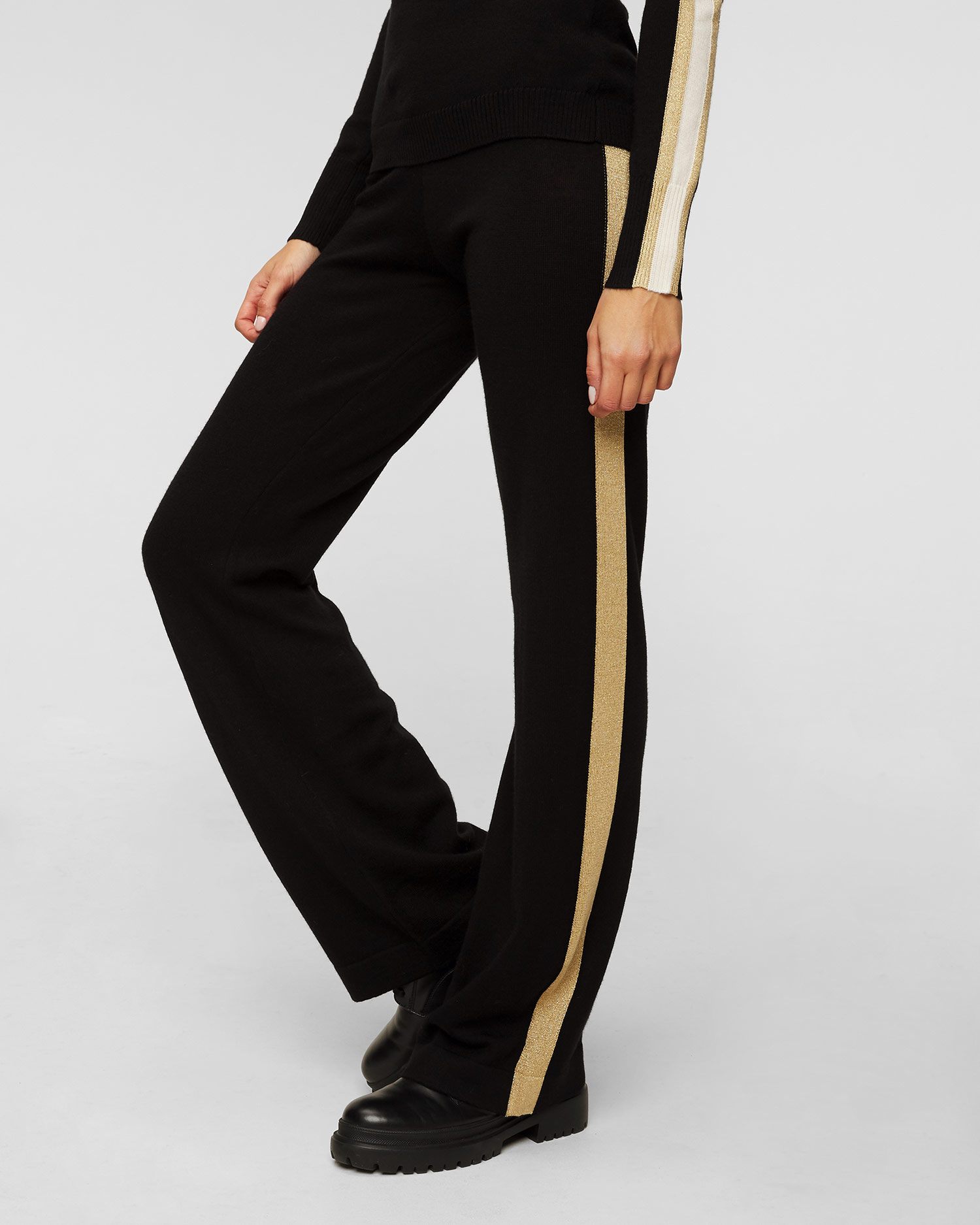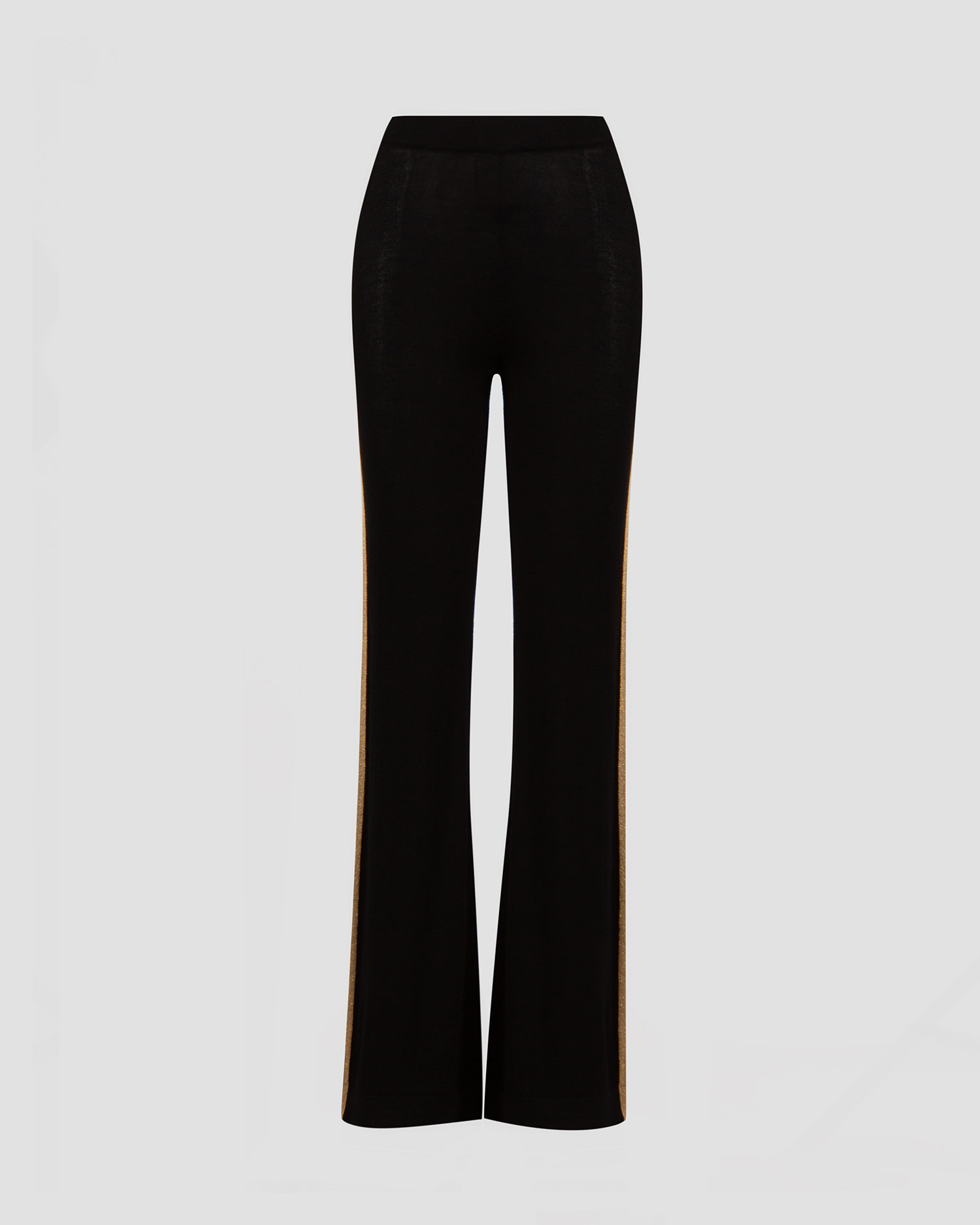 The black We Norwegians Geilo women's wool trousers will add a fashionable touch to your casual styling. It has been made from soft and warm Geilo fabric - a knitted wool fabric with added lurex fabric fibres. The material has natural breathability and thermoregulation properties and is characterised by elasticity, so it will provide high comfort and convenience. Regular-fit trousers with a high rise and long legs that flare out at the bottom. Decorative piping in a contrasting colour along the outer side.