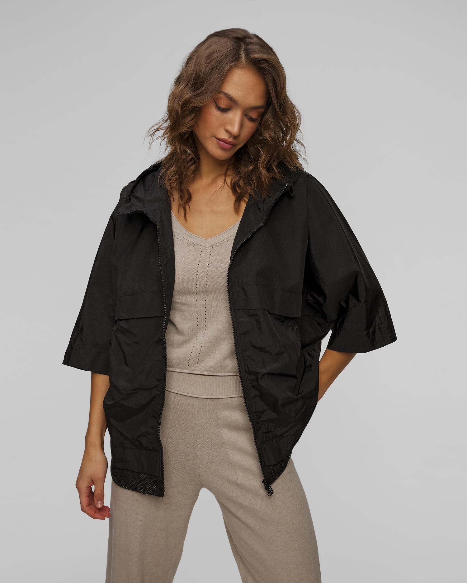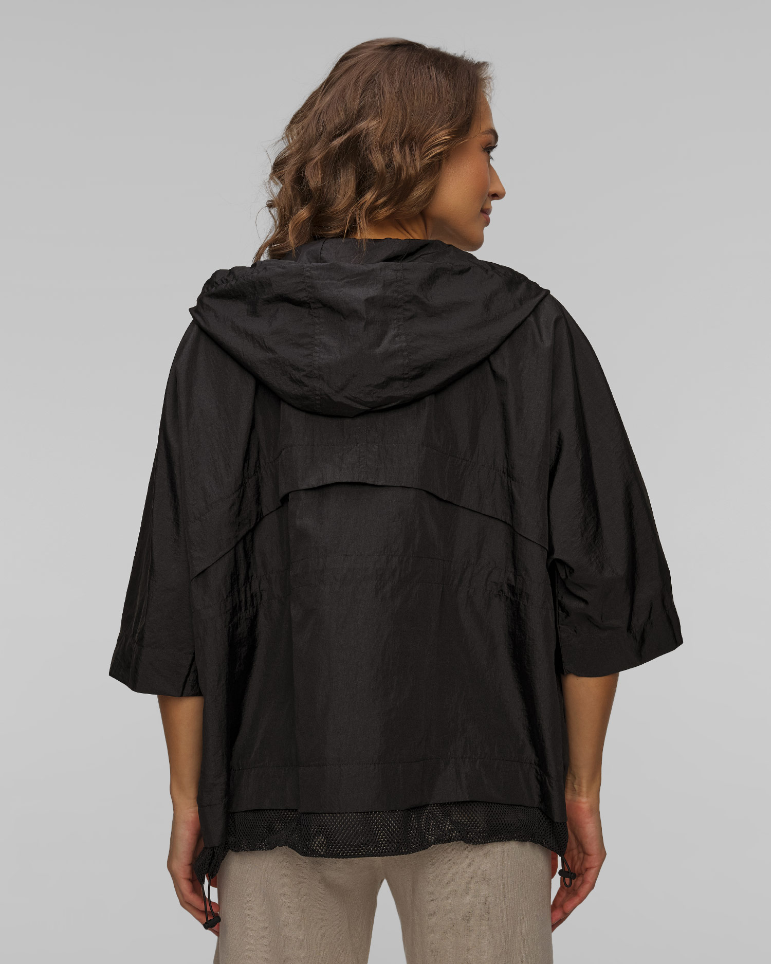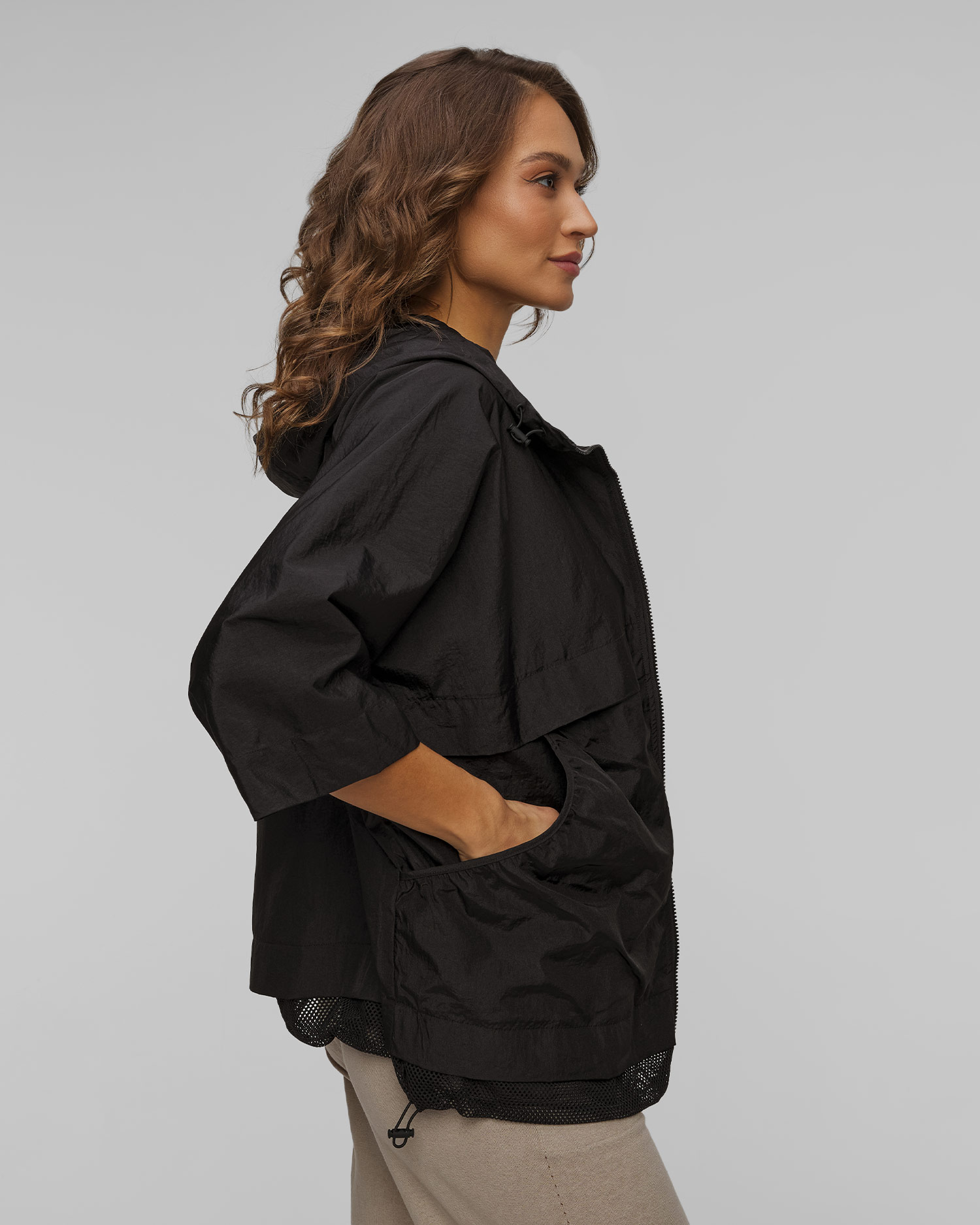 Fabricată din crep ușor și încrețit. Mâneci 3/4, guler înalt cu glugă și legături, tiv cu inserție de plasă reglabilă cu cordon elastic, buzunare laterale, fermoar cu cursor dublu. Tăietură oversize.