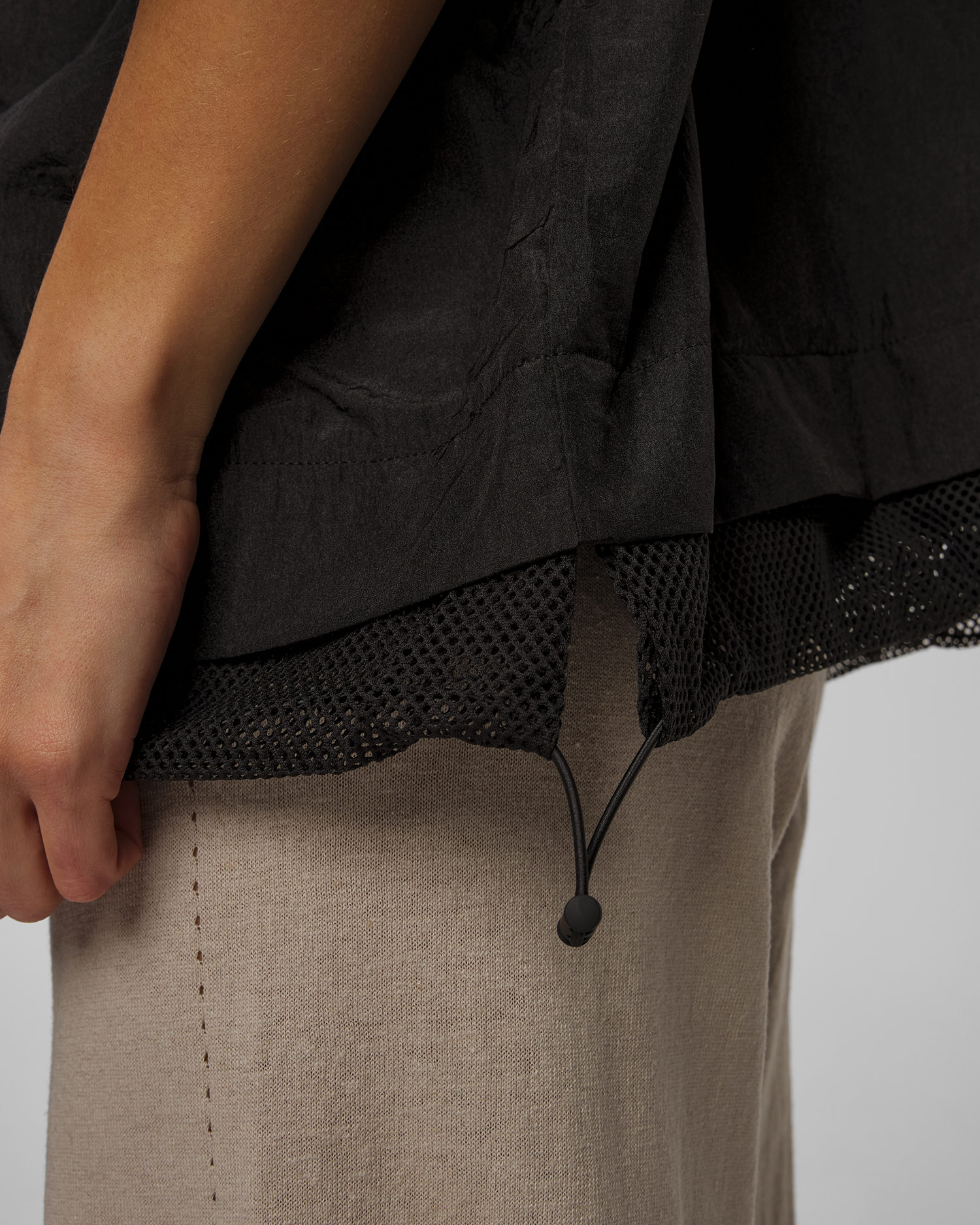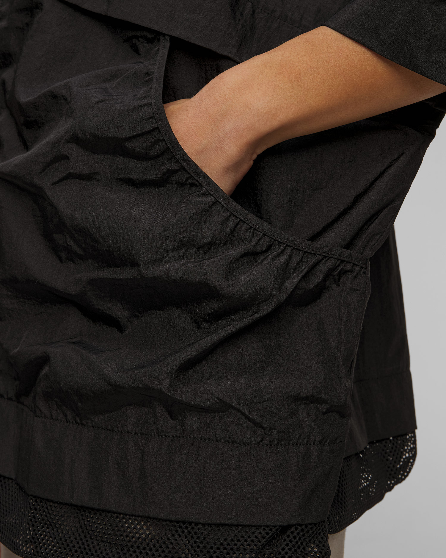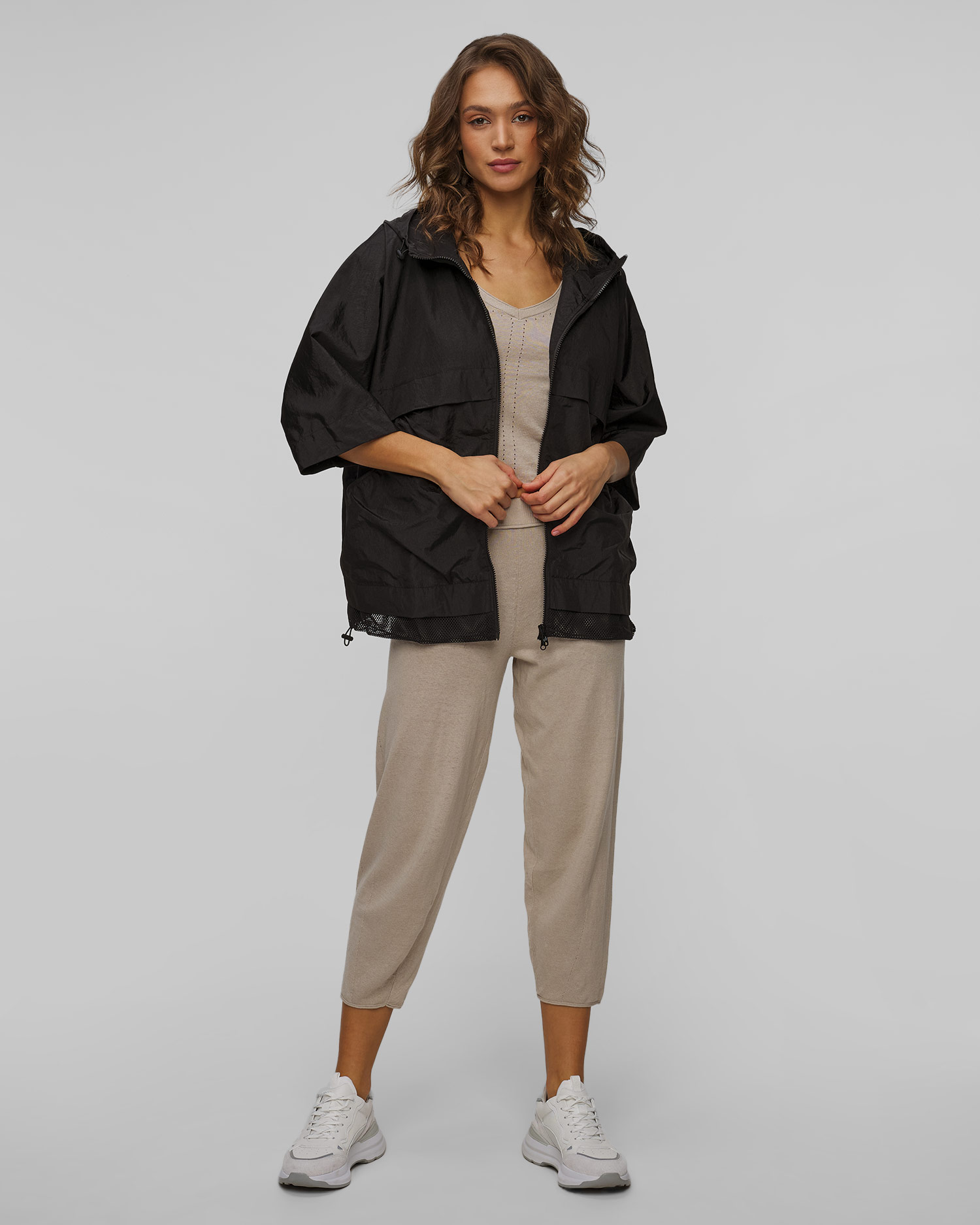 Fabricată din crep ușor și încrețit. Mâneci 3/4, guler înalt cu glugă și legături, tiv cu inserție de plasă reglabilă cu cordon elastic, buzunare laterale, fermoar cu cursor dublu. Tăietură oversize.