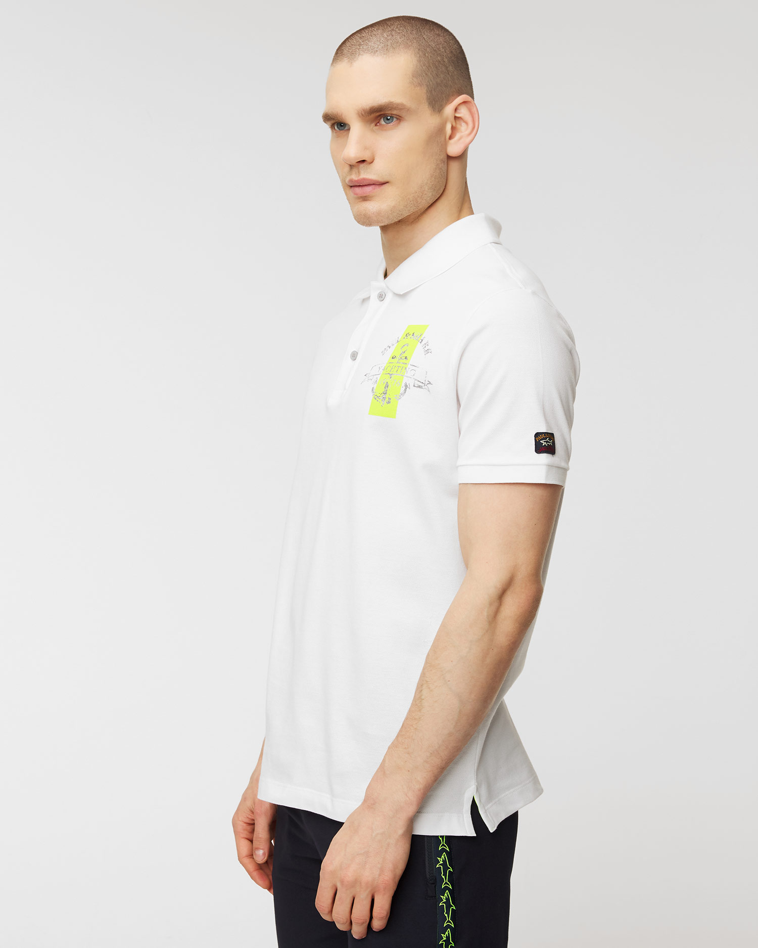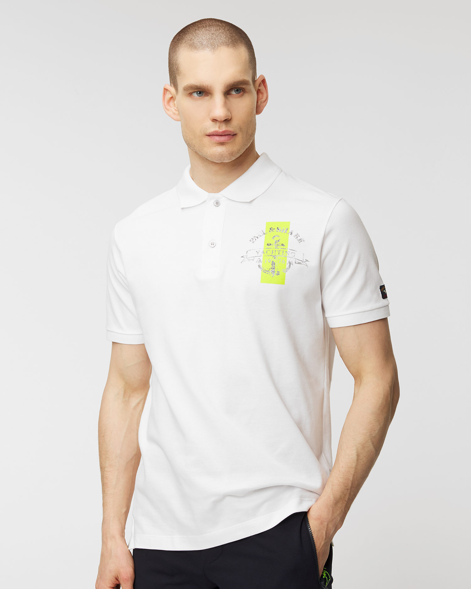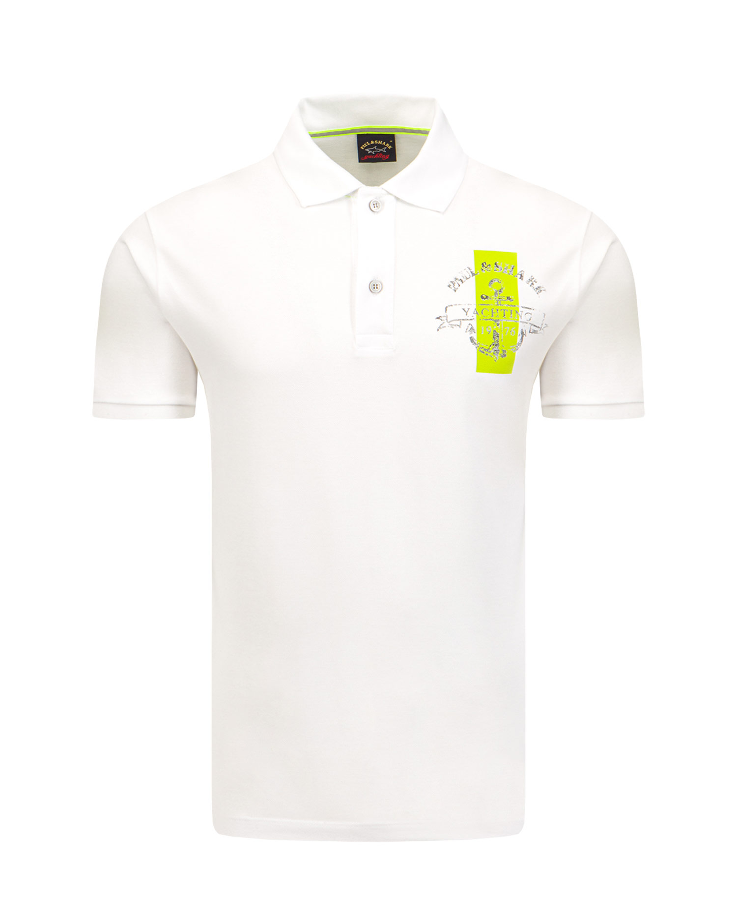 Tricoul polo PAUL&SHARK cu croială clasică minimalistă, confecționat dintr-o tesătură sportivă din bumbac în stil pique. Țesătura pique nu este doar plăcută pentru piele, dar îi permite să și respire, ceea ce o face excelentă pentru zilele toride. Mâneci terminate cu o bordură elastică. Guler striat, închis cu doi nasturi. Decorat pe piept imprimeu cu logo-ul Paul & Shark Yachting pe fundal verde lime.